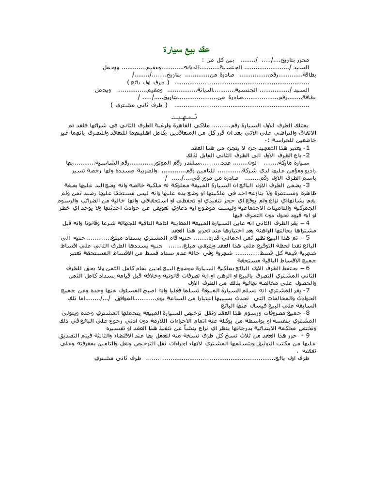 عقد مبايعة سيارة. 9 30 2013 11 41 10 am. 3 يضمن الطرف الاول البائع ان السيارة المبيعة مملوكة له ملكية خالصه وانه يضع اليد عليها بصفة ظاهرة ومستمرة ولا ينازعه احد في ملكيتها او وضع يده عليها وانه ليس مستحقا عليها رصيد ثمن ولم يقم بشانهااي نزاع ولم يوقع اي حجز. لن تحتاج للبحث كثييرا عن عقد بيع سيارة حيث اليك نضع رابط تحميل مباشر لنموذج عقد بيع سيارة سواء كانت مستعملة او حتي جديدة فالسيارات والدراجات النارية لها عقدة وصيغ خاصة بها وهي كثيرة ويتم. محمد متولى created date.